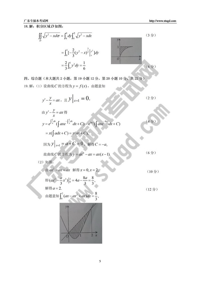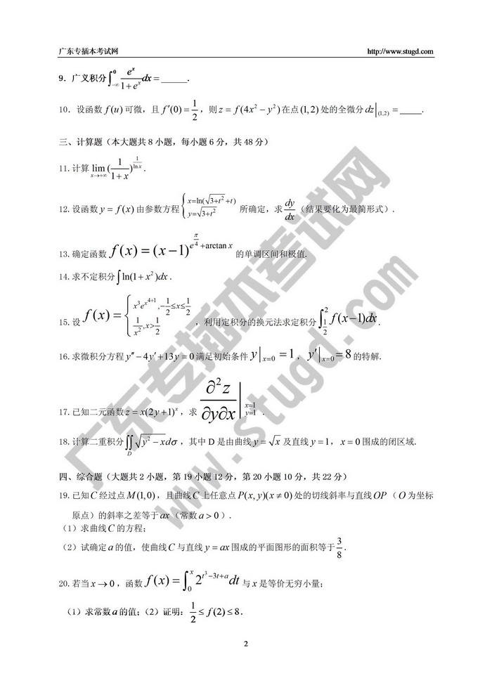 2016年广东专插本《高等数学》试题及标准答案