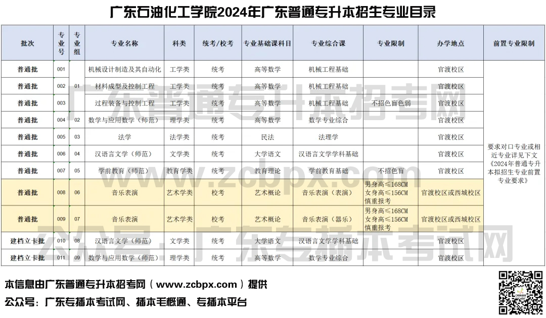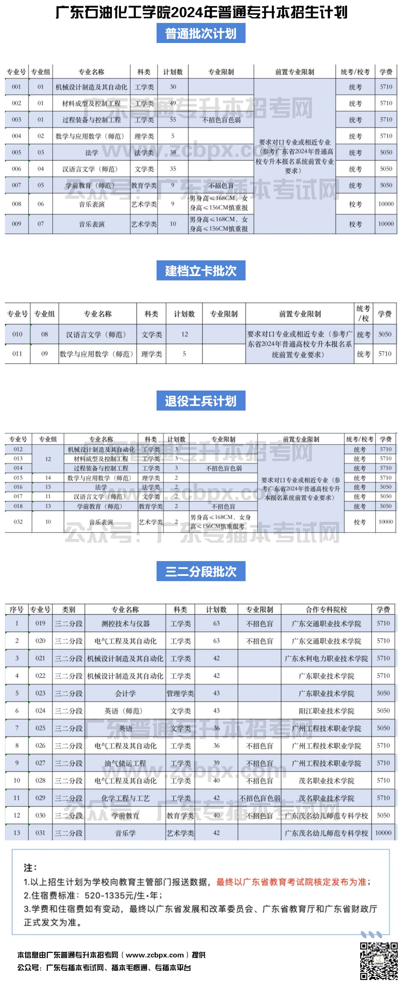 1.我校负责对选报了招生院校自行组织命题的专业综合课的考生报名资料进行审核,审核结果分为“通过”和“不通过”两种(通过不通过原因会在报名系统反馈)。我校招生与就业指导中心认真对考生上传的资料进行审核,初审合格的考生提交省招生办进行复核。各专业具体要求详见下文《广东石油化工学院2024年专升本专业目录》(附件1)。被录取的考生入学后不得转专业。